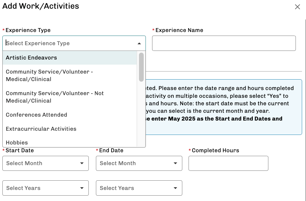 For activities spanning multiple years, enter the full start and end dates in AMCAS and calculate total completed hours at the time of submission. If the activity is ongoing, mark it as such and estimate future hours conservatively.