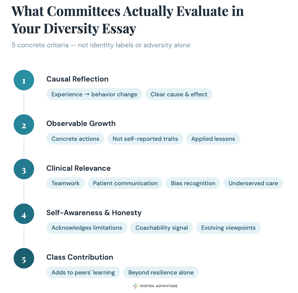Admissions committees evaluate how your experiences will benefit peers and patients—not just how they tested your resilience. Strong diversity essays explain what unique perspective the applicant brings to group discussions, collaborative learning, and patient care.