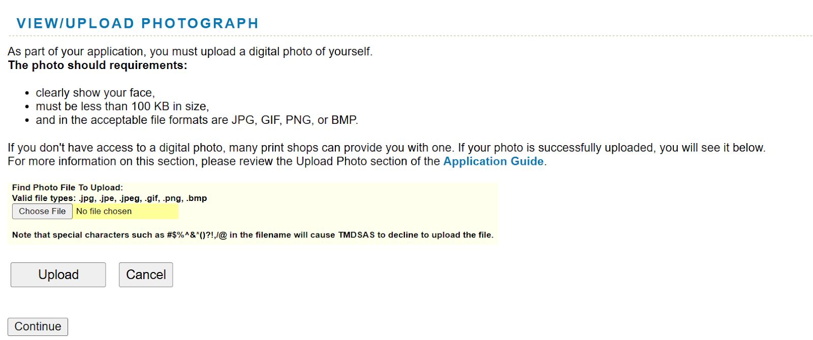 Uploading a digital photo is a compulsory part of the TMDSAS application. The photo must be smaller than 100KB and in .jpg, .gif, .png, or .bmp formats to ensure compatibility and processing.