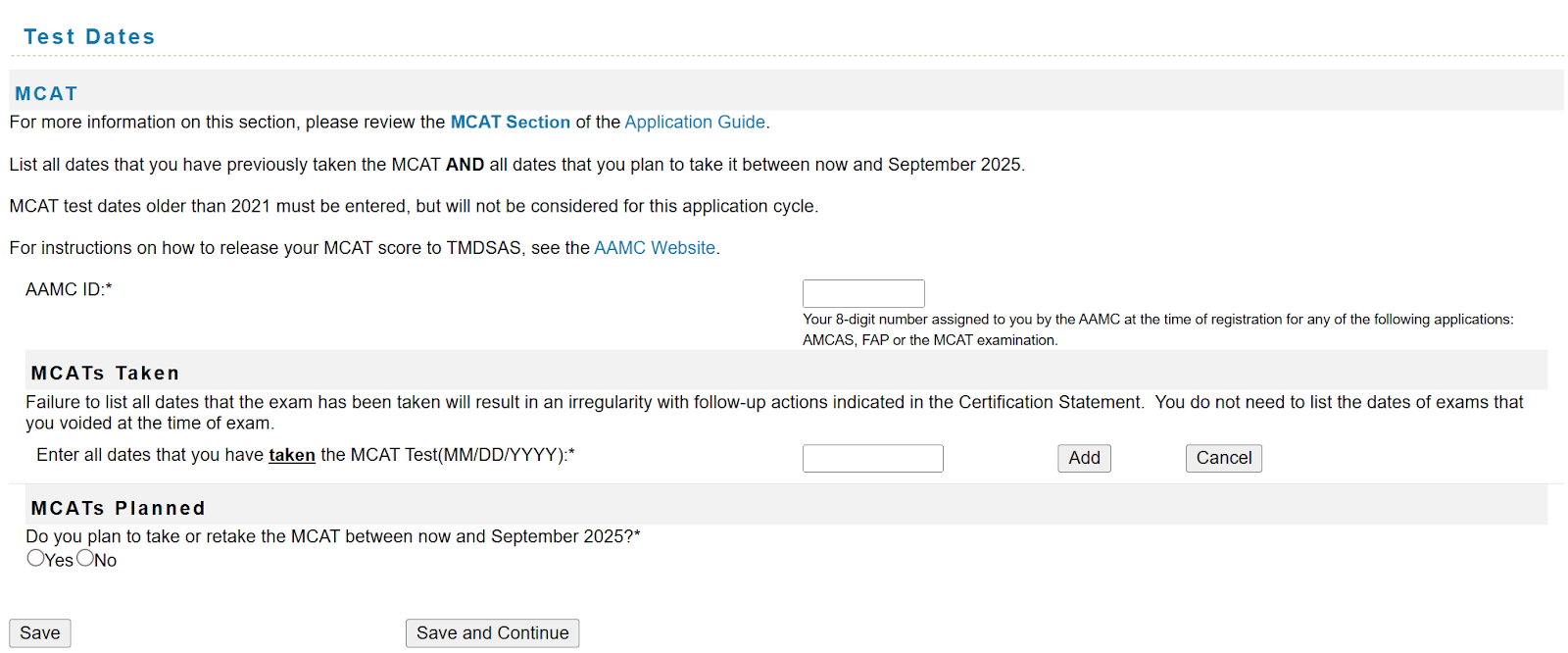 In addition to scores, applicants must enter the dates they have taken or will take the MCAT between September of the application year and their application time.