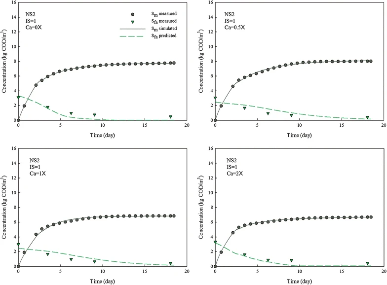 In this research, the LCFA concentration in NS1 and NS2 digesters was 9.9 g COD/L and 3.1 g COD/L, respectively, noticeably higher than the approximate inhibitory threshold range (~0.5–1.5 g COD/L) mentioned in literature. Severe inhibition occurred in digesters with low inoculum concentration, as noticed by extremely low methane production. However, no inhibition was observed for digesters with appropriate I/S ratio and proper calcium dosing. It seems that high inoculum concentration could be used as a means of alleviating the inhibition mediated by LCFAs. Calcium ion could also be an effective way to bond LCFAs and thus keep microbial cells from being tightly wrapped by LCFAs. The impact of calcium ion, however, is dependent on the concentration of inoculum, in which a minimum inoculum concentration is required.